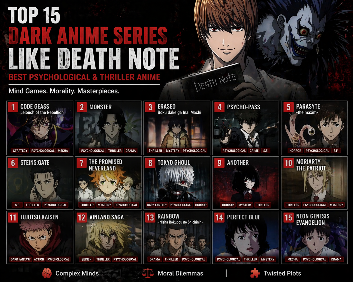If you loved the intense mind games and dark storytelling of Death Note, there are many anime that offer a similar experience. From psychological thrillers and dystopian worlds to horror and supernatural mysteries, dark anime explores the deeper side of human nature. This article highlights 15 must-watch dark anime series including Monster, Psycho-Pass, Tokyo Ghoul, and Code Geass: Lelouch of the Rebellion. If you enjoy suspense, moral dilemmas, and unpredictable twists, these anime will keep you hooked from start to finish.